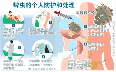 ●除虫如果发现蜱虫附着在身体上,不能立即用镊子等工具将其除去,因为蜱虫体上可能含有传染性病原体,在受到刺激后,蜱虫会越发往体内钻,并加大剂量地释放蜱虫唾液,所以直接用工具将蜱虫摘除或是用手指将其捏碎的方法是非常不正确的,民间还有些诸如用火烧蜱虫屁股等方法均不可取。