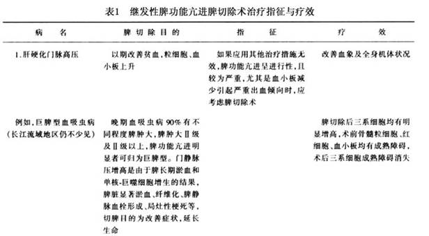 1.可考虑作脾切除术 已诊断为脾功能亢进者,如果是继发性脾功能亢进者,临床症状较轻。以治疗原发病为主,随着原发病治疗好转或治愈,脾脏可以缩小,血象与骨髓象改善。原发病本身治疗困难者,或者原发病已进入晚期,脾功能亢进明显者,可创造条件行脾切除术,同时或术后继续治疗原发病。亦有一些继发性脾功能亢进,主要病变在于脾脏本身,切脾作为治疗首要方案。现将其中常见重要的继发性脾功能亢进治疗指征列表举例说明如下,以供参考(表1)。