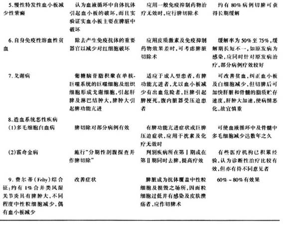 (2)慢性粒细胞白血病:过去曾认为可以改善贫血、血小板减少及一般症状,并认为有预防慢性粒细胞白血病急变作用;现多认为脾切除并非作为治疗慢性粒细胞白血病及其急变的有效手段。